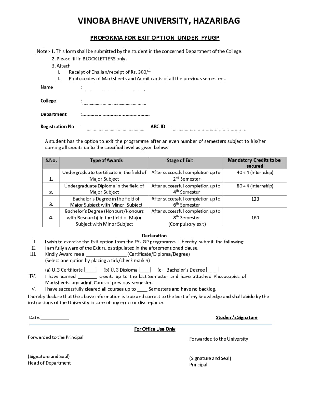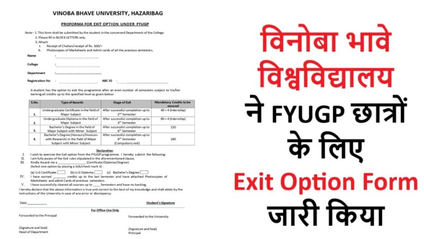 हजारीबाग: Vinoba Bhave University (VBU) ने FYUGP (Four Year Undergraduate Programme) के अंतर्गत अध्ययनरत विद्यार्थियों के लिए Exit Option Form जारी कर दिया है। विश्वविद्यालय द्वारा जारी सूचना के अनुसार, वे छात्र जो निर्धारित सेमेस्टर के बाद Certificate, Diploma या Degree के साथ पाठ्यक्रम से Exit लेना चाहते हैं, उन्हें निर्धारित प्रोफॉर्मा भरकर अपने संबंधित कॉलेज/डिपार्टमेंट में जमा करना होगा।
